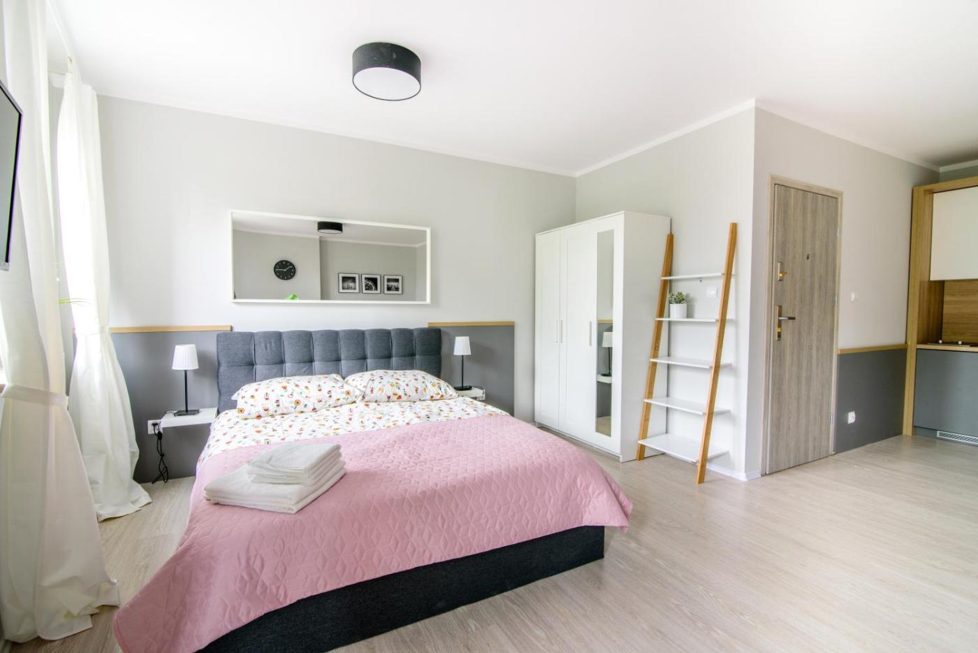 Apartament. This apartment includes a kitchen, a seating area, 1 separate bedroom and 1 bathroom with a walk-in shower and a hairdryer. The fully equipped kitchen has a stovetop, a refrigerator, kitchenware and a microwave. This apartment features a tea and coffee maker, flat-screen TV, city views, as well as chocolate for guests. The unit has 1 bed. Apartament - 2 osobowy. Powierzchnia pokoju ok.: 30 mkw.