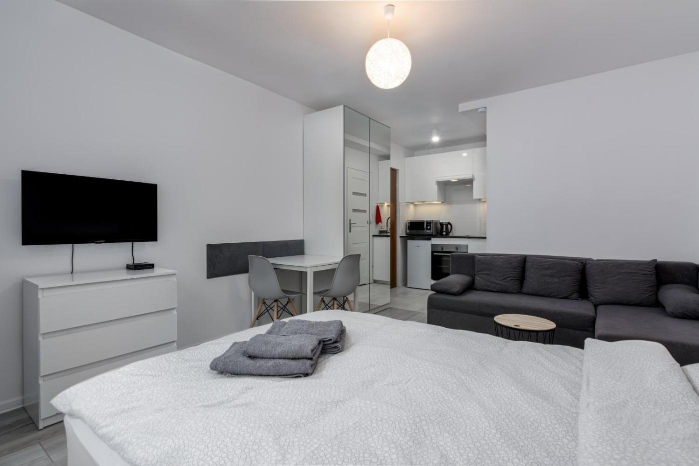 Apartament. Boasting a private entrance, this apartment also comes with 1 bedroom, a seating area and 1 bathroom with a walk-in shower and a hairdryer. Meals can be prepared in the kitchen, which features a stovetop, a refrigerator, kitchenware and an oven. The apartment features a washing machine, a dining area, a wardrobe, an electric kettle, as well as a flat-screen TV with cable channels. The unit has 1 bed. Apartament - 2 osobowy. Powierzchnia pokoju ok.: 25 mkw.